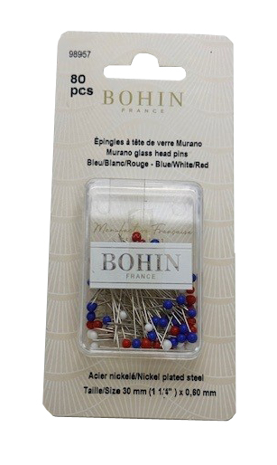 Epingles tete de verre murano 30 mm (BOHIN) boite de 80 piéces bleu blanc rouge 98957.